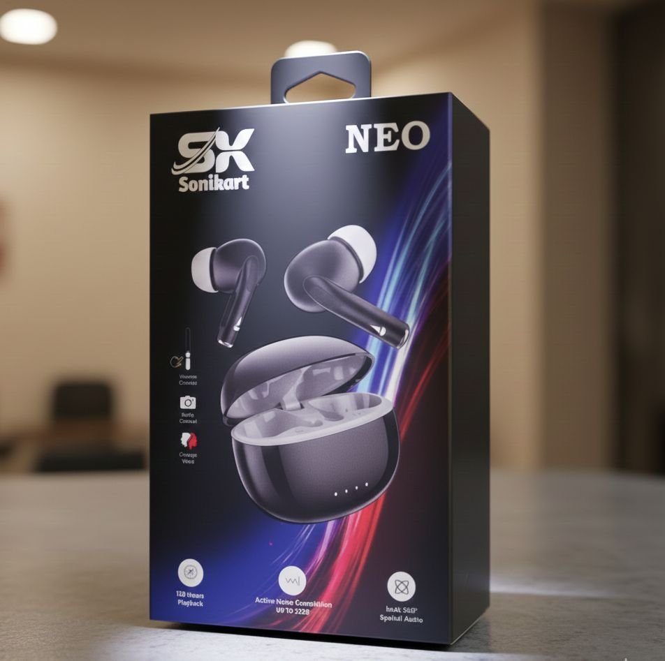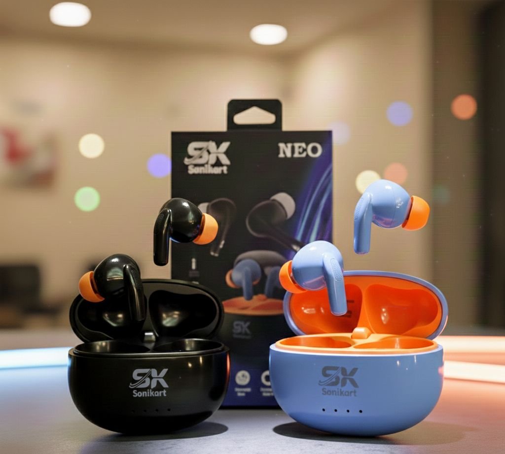 Sonikart SK NEO True Wireless Earbuds powerful bass aur crystal-clear sound ke saath aate hain, jo music, calls aur gaming ke liye perfect hain.